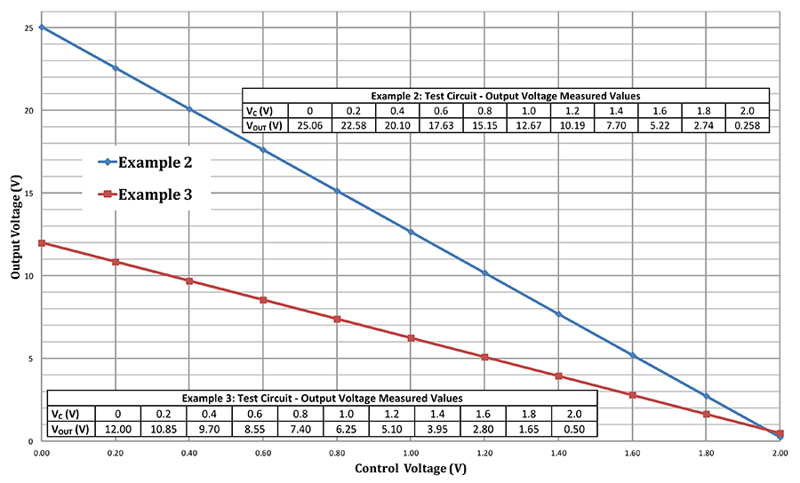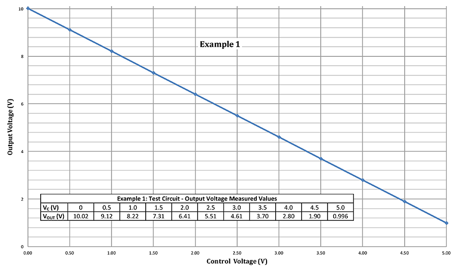 在此示例中,我們希望使用從0到5.0V的控制電壓來生成從1.0V到10.0V的輸出電壓,即,在V C(max) = 5.0V時(shí)出現(xiàn)的V OUT(min) = 1.0V ,并且V OUT(max) = 10.0V(在V C = 0 時(shí)發(fā)生)。