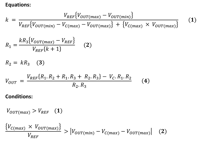 重要的是要滿足圖2所示的條件。第一個(gè)條件要求V OUT的最大值必須大于V REF。必須確保等式2的分子不能為負(fù)。必須滿足條件2的要求,以確保等式1的分母不能為零或負(fù)。