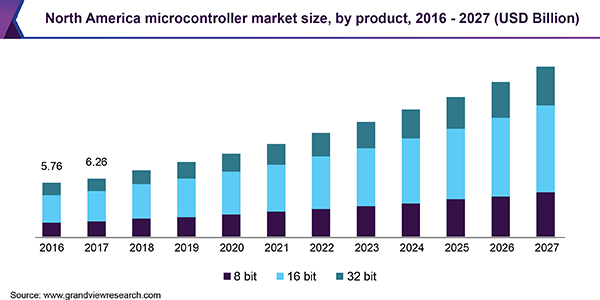 2019年,單片機開發市場規模為208.2億美元,預計從2020年到2027年,復合年增長率將達到10.8%。2019年,全球單片機出貨量超過300億個。汽車,消費電子產品的顯著增長,而醫療保健行業可以歸因于產品需求的增長。單片機制器單元(MCU)主要用于需要用戶充分控制的設備中。行業競爭的加劇導致產品價格低廉,預計將進一步刺激需求。隨著智能電網的出現,人們對智能能源管理的認識不斷提高,有望進一步推動對MCU的需求。