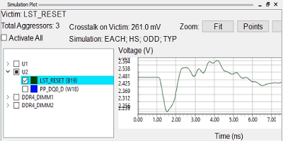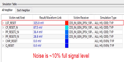 定義設(shè)置后,該工具將返回與設(shè)計(jì)規(guī)則進(jìn)行比較的結(jié)果。結(jié)果以顏色編碼并按降序排列。盡管它們是用顏色編碼的,但您也可以看到一個(gè)數(shù)值結(jié)果,以便可以比較由于互連信號(hào)噪聲引起的峰值過壓/欠壓,并將其與信令標(biāo)準(zhǔn)進(jìn)行比較。