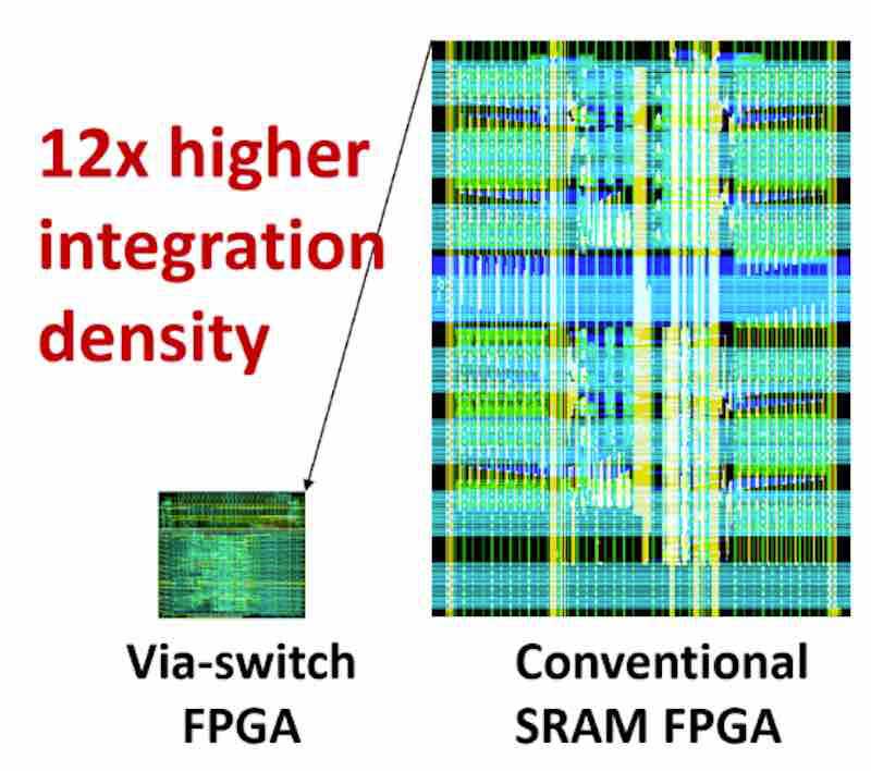 (大阪大學開發的Via-Switch FPGA與常規SRAM FPGA在尺寸和集成密度上的比較)
