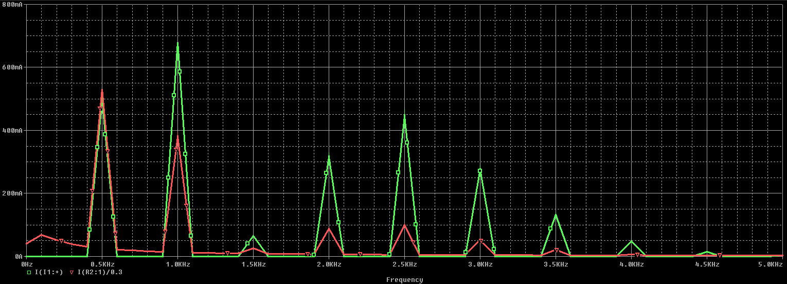 下圖顯示了一個簡單的瞬態分析,它比較了源電流波形(綠色)和負載電流(紅色)。我們可以看到瞬態響應在前約1 ms內消失,并且負載處的波形在以后的所有時間都保持一致。顯然,信號電平會有所衰減,但這主要是由于Pi網絡和負載的綜合阻抗,而不僅僅是負載本身。
