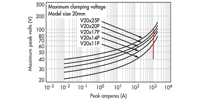 3. MOV數(shù)據(jù)表還將具有電壓與電流的曲線,例如圖2中20mm器件的最大鉗位電壓曲線。