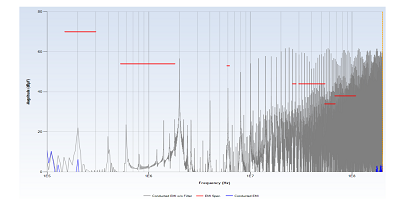 上面是開關電源輸入端的傳導EMI的仿真。紅線是CISPR25限制,如果要通過汽車用途認證,則需要遵守這些限制。該設計并非旨在用于汽車用途,但這是一個易于使用的示例。灰色混亂是沒有濾波器的傳導EMI。它顯然嚴重超出了限制。您可能只需要在左下角和右下角劃出的藍色走線就是帶有基本PI濾波器的傳導EMI。