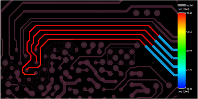 要檢查阻抗變化,請在分析工具欄中選擇“阻抗工作流程”選項。選擇相同的網絡以分析并運行仿真??梢酝ㄟ^選擇“阻抗視覺”選項來查看整個互連的阻抗,該選項將再次顯示帶有顏色編碼阻抗值的熱圖。