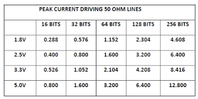 可以為任何邏輯系列計算圖2所示的電流。例如,如果邏輯系列為3.3V CMOS,則每條線的峰值電流約為33 mA。如果使用這種邏輯形式創建數據總線,則當所有位同時從0轉換到1時,總線所需的峰值電流為總線中位數的33 mA倍。表1列出了幾個邏輯系列的峰值電流(以安培為單位,在各種總線寬度下)。