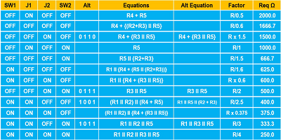 通過四個開關,可以進行16種開關設置組合。使用12個開關設置,R eq有12個不同的值。(剩余的四個開關設置會產生R eq的重復值;這些替代設置在標有“ Alt”的列中捕獲。)在“ Equations”列中給出了計算12種不同組合的R eq值的方程式,而“ Alt公式”列列出了替代組合的公式。