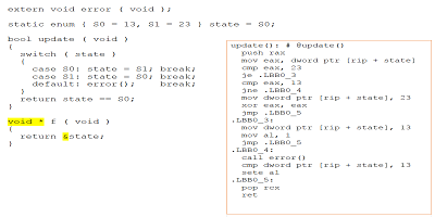 編譯器還決定,由于實際對象(13和23)的值未在數字上下文中使用,因此它將僅使用0和1的值在狀態之間切換,然后使用異或“或”更新狀態值。二進制文件遵循“好像”義務,并且代碼快速緊湊。在其職權范圍內,編譯器做得很好。