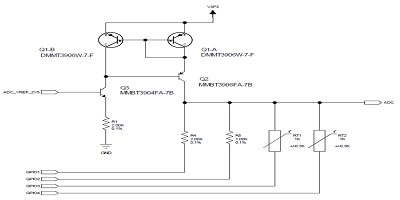 該設計將Q1-Q3晶體管與R1電阻結合使用,以形成一個恒流源,該源使用2.5V ADC基準電壓源提供約1mA的電流(見圖)。當相應的GPIO引腳被驅動為低電平時,校準電阻R4和R5以及RT1和RT2 RTD傳感器可以吸收該電流。不用時,GPIO引腳為三態。在ADC輸出端測量電壓。