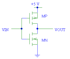 參考上面的CMOS反相器圖,由于CMOS器件輸入端的電壓在5伏和0伏之間變化,因此PMOS和NMOS的狀態將相應地不同。因此,如果將每個晶體管建模為一個由VIN激活的簡單開關,那么毫無疑問,我們可以看到CMOS反相器的功能。