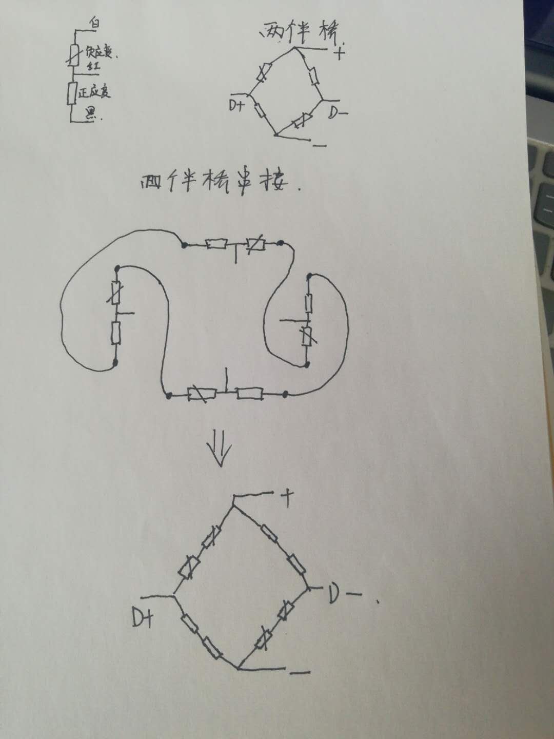 現在需要將四個半橋稱重傳感器串接在一起,我們要注意接法。其原理是將負應變電阻兩個接在一起,正應變電阻兩個接在一起,剛好有4組電阻:兩組正應變、兩組負應變,可以組成一個全橋。如下圖是我手繪的全橋稱重傳感器接法: