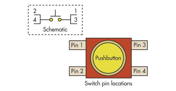 盡管現(xiàn)代組件已變得萬(wàn)無(wú)一失,但研究PCB設(shè)計(jì)中計(jì)劃的組件以很大程度地減小對(duì)端板構(gòu)建的影響仍然很重要。有些組件的包裝細(xì)節(jié)不明顯。盡管許多IC和分立元件都有標(biāo)準(zhǔn)封裝,但某些封裝具有特殊的屬性,使它們?nèi)菀资艿胶附渝e(cuò)誤和其他組裝錯(cuò)誤的影響,例如非標(biāo)準(zhǔn)的引腳焊盤幾何形狀或分配。例如,在圖5中,瞬時(shí)按鈕開關(guān)乍一看將使針腳1和2短路在一起,而針腳3和4基于每對(duì)針腳的接近程度短路。但是數(shù)據(jù)表中的器件原理圖表明實(shí)際上已連接了其他引腳。