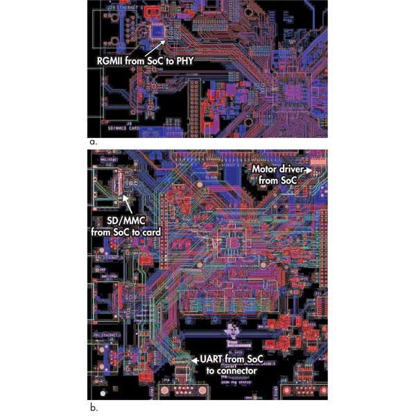 請(qǐng)注意,在原理圖級(jí)別上,在兩種設(shè)計(jì)之間進(jìn)行更改似乎沒(méi)有太多困難,因?yàn)樗皇怯眠m當(dāng)?shù)倪x擇(例如RS-232收發(fā)器與以太網(wǎng)物理層或PHY)替換了終端設(shè)備/電路 。但是,在審查PCB布局實(shí)現(xiàn)時(shí),對(duì)不同接口的要求發(fā)生了巨大變化,這表明必須對(duì)PCB布局和隨后的布線進(jìn)行哪些重大更改才能開發(fā)出堅(jiān)固的PCB。UART,SD / MMC卡,GPIO和電機(jī)控制將被布線到可放置在PCB上空間不同位置的多個(gè)設(shè)備。相比之下,以太網(wǎng)總線將被布線到單個(gè)設(shè)備,即以太網(wǎng)PHY,該設(shè)備可能會(huì)放置在與SoC相當(dāng)近的位置。