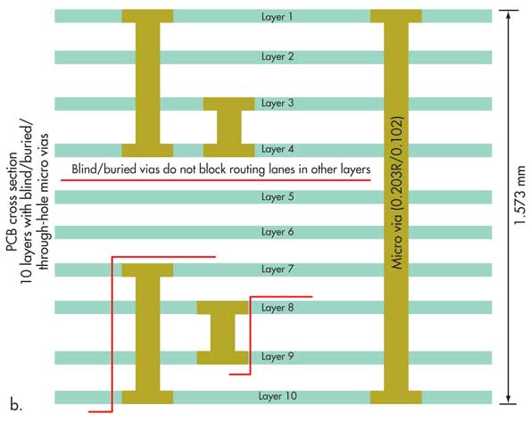 6.使用內(nèi)部層布線信號(hào)的能力是使用較小的盲孔和掩埋過(guò)孔的重要好處。但是,應(yīng)在此利益與電路板的額外成本之間進(jìn)行權(quán)衡。